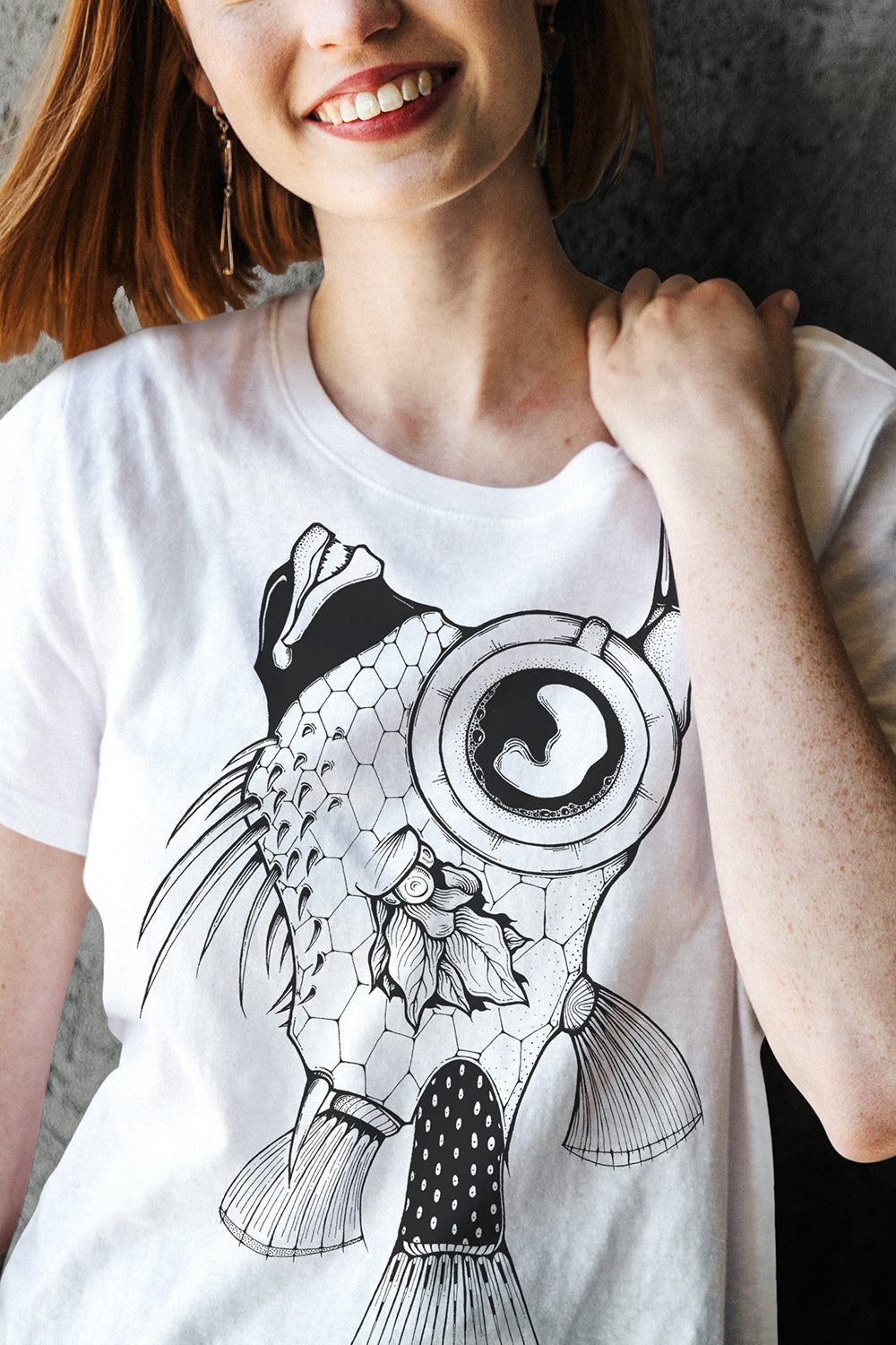 A hand-drawn fish drifts across the fabric, wrapped in abstract, retro-infused typography.